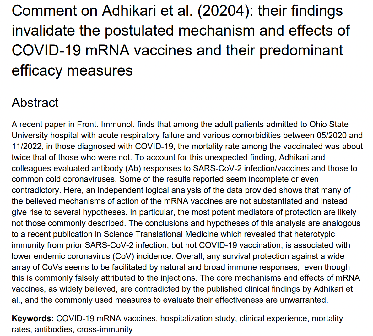 Siguna Mueller. Comment on Adhikari et al. Their findings invalidate the postulated mechanism and effects of COVID-19 mRNA vaccines and their predominant efficacy measures. https://osf.io/t2k6f