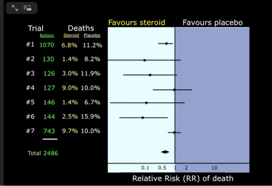 This particular forest plot was derived from a systematic review that asked the question: Do maternal corticosteroids versus no corticosteroids for preterm birth prevent newborn deaths?