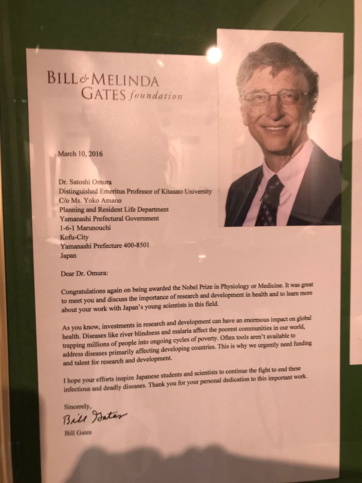 A highlight of our recent WCH mission in Japan was a guided tour of the Kitasato Memorial Museum by Professor Satoshi Omura. As you probably know by now, Professor Omura discovered avermectin, the precursor of ivermectin, on a Japanese golf course in the late 1970s. Due to this and his incredible work since, the museum has a whole wing dedicated to Prof. Omura’s work. I have previously written about this and shared some photos of what can be found there, including this curious 2016 letter from Mr Bill Gates.