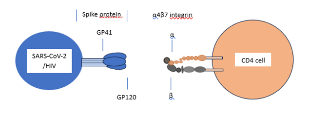 The α4β7 integrin on the surface of CD4+ T cells plays a key role in both the initial cell attachment and transport of both HIV and SARS-CoV-2 throughout the body. In the case of both viruses, the α4β7 integrin binds to the virus glycoprotein GP120, allowing both viruses to infiltrate CD4 immune cells. The α4β7 integrin on the surface of the CD4 immune cells then binds to MAdCAM-1 with HIV or SARS-CoV-2 hidden inside the immune cell. The infected CD4 cells then carry the viruses into the mucosal tissues, like a Trojan horse, where the viruses then replicate and are disseminated throughout the body.