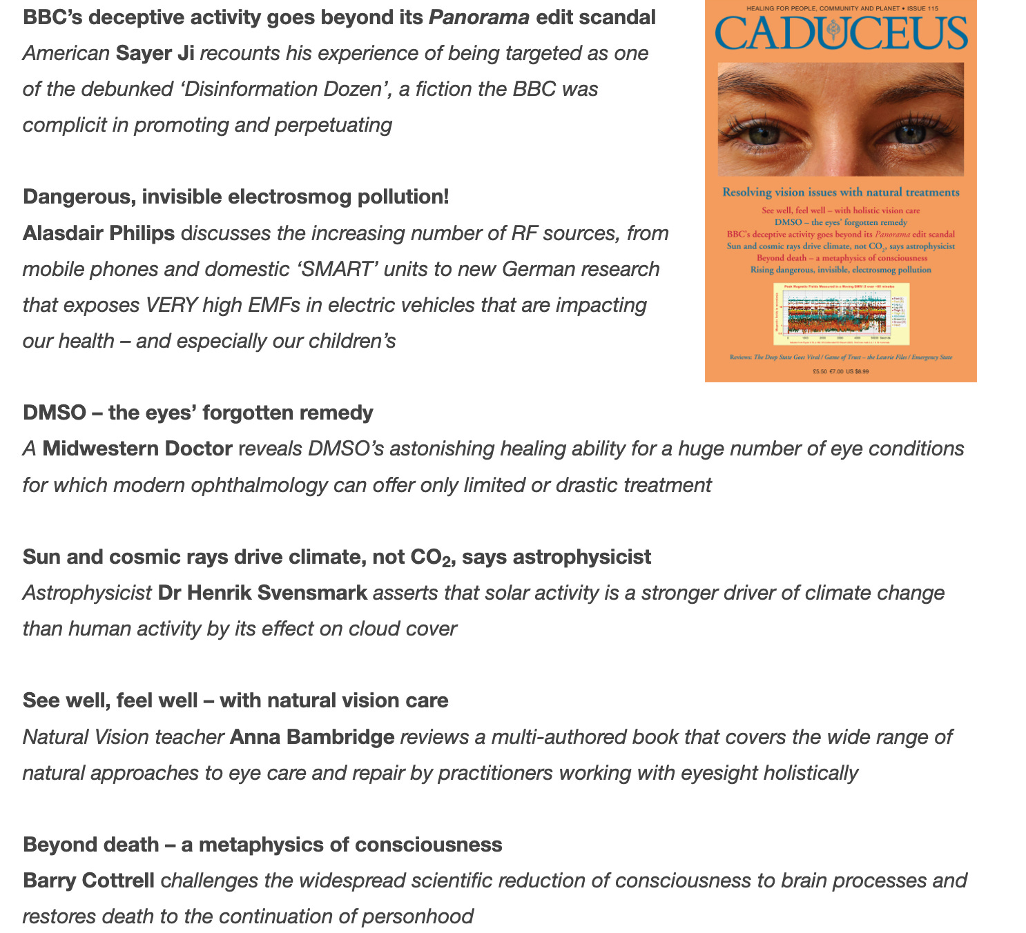 Caduceus is a healing, spiritual magazine focusing on psychological, emotional, spiritual, ecological and environmental health, therapy and growth, including natural, holistic, energy and complementary medicine.