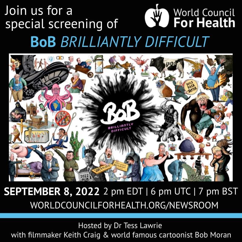 All credit to the genius of Bob Moran. The World Council for Health is screening a wonderful new documentary about Bob this Thursday, details below.)