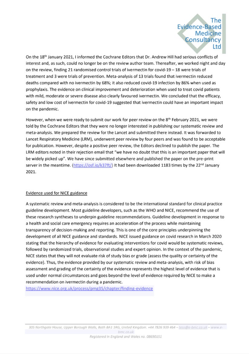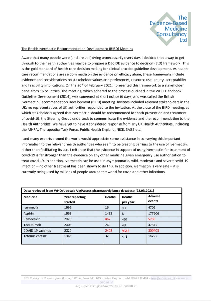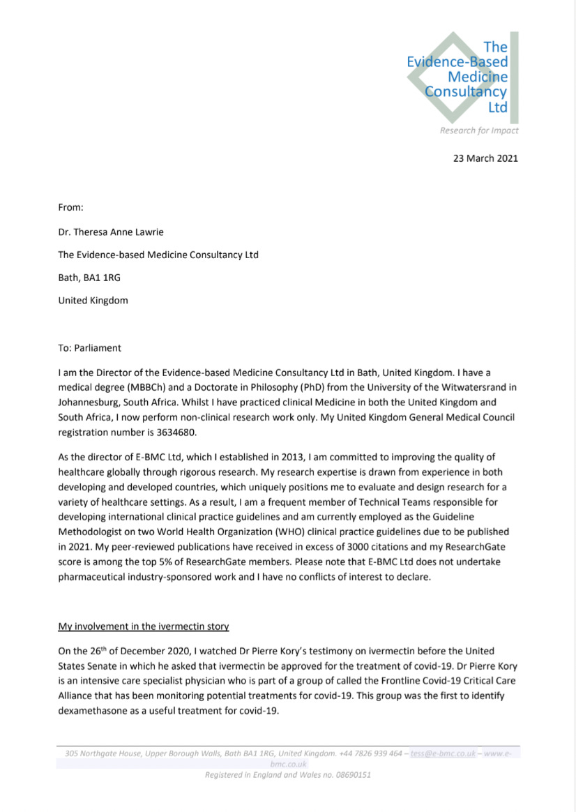 Below is the letter that accompanied my Parliamentary Submission to MP Mr. Jeremy Hunt on the 23/4th March 2021. The submission included the British Ivermectin Recommendation Development (BIRD) group Evidence-to-Decision document and a pre-print version of our expert systematic review article later published in the American Journal of Therapeutics and now ranked 8th out of 26 million scientific articles.