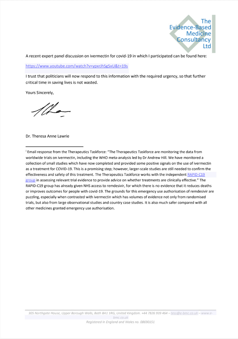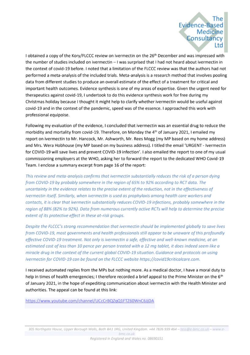Please note that the Youtube video of the ivermectin expert panel discussion referenced at the end of the letter was taken down.