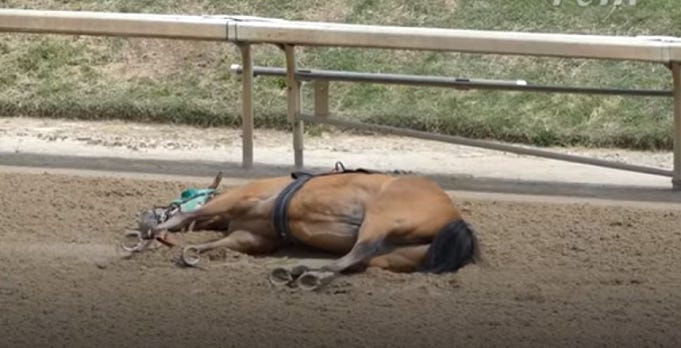 And on April 29, 2023, horses racing at Churchill Downs began to die during races or suffer such severe injuries during races that they were euthanized. So many horses have died this spring that on June 2 it was announced that the spring meet at the Downs would be suspended as of June 10. Officials at Churchill Downs are panicked because horses racing there have died in much larger numbers this spring than ever before. In 2022, nationwide, about 1.25 deaths occurred for every 1,000 horses starting at the gate. But since April 29, 2023, 12 deaths have occurred among just 1,600 starts at Churchill Downs, a sudden and unprecedented 8-fold increase in racehorse mortality.