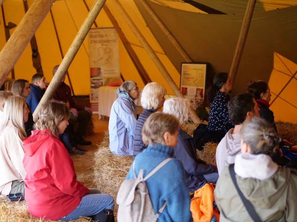 This is in the workshop and therapist tent where people could learn about different healing modalities and try them out too.