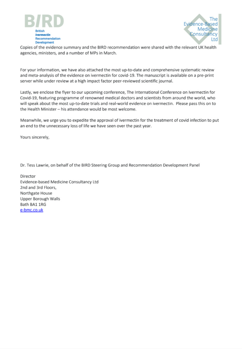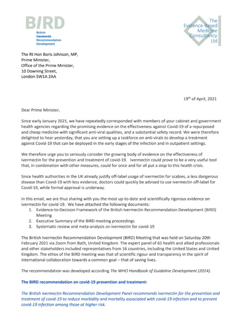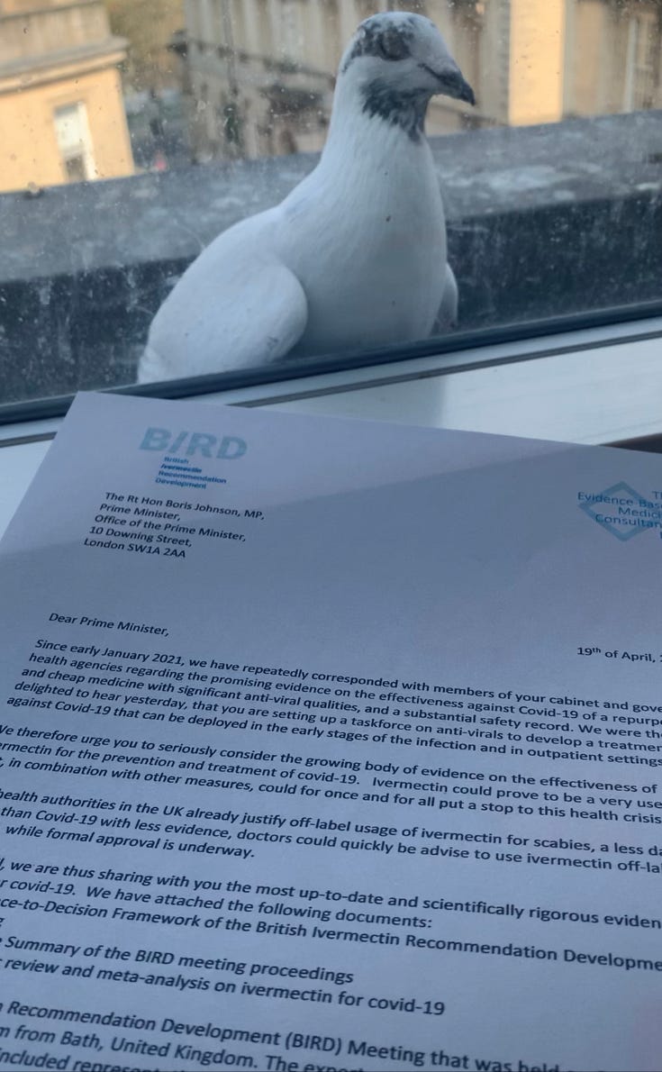 A Hard copy of this cover letter to the Prime Minister, Mr. Boris Johnson, along with a two-inch thick evidence pack on Ivermectin, was delivered and signed for at 10 Downing Street on the 21st April 2021.