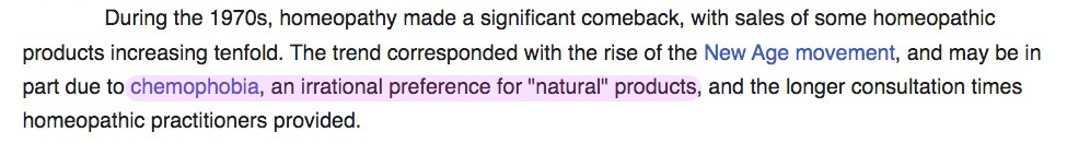 Reader, are you suffering from ‘chemophobia’? I think I may be, though I would argue that a preference for natural products is entirely rational. Out of curiosity, I thought I’d look at what the Wikipedia entry for homeopathy used to say. Here’s what it said on 31 October 2003: