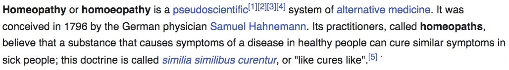 Let’s start with the lies and misinformation about homeopathy. Here’s how the internet’s propaganda factory Wikipedia currently defines it: