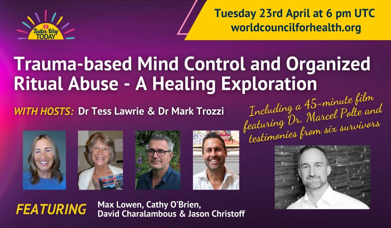 On Tuesday 23 April 2024 at 18h00 UTC, the World Council for Health (WCH) is bringing you a panel discussion on trauma-based mind control and Organised or Satanic Ritual Abuse (ORA/SRA). You can join the session at the WCH Newsroom. We will also be streaming live to @freeWCH and @lawrie_dr on X (Twitter).