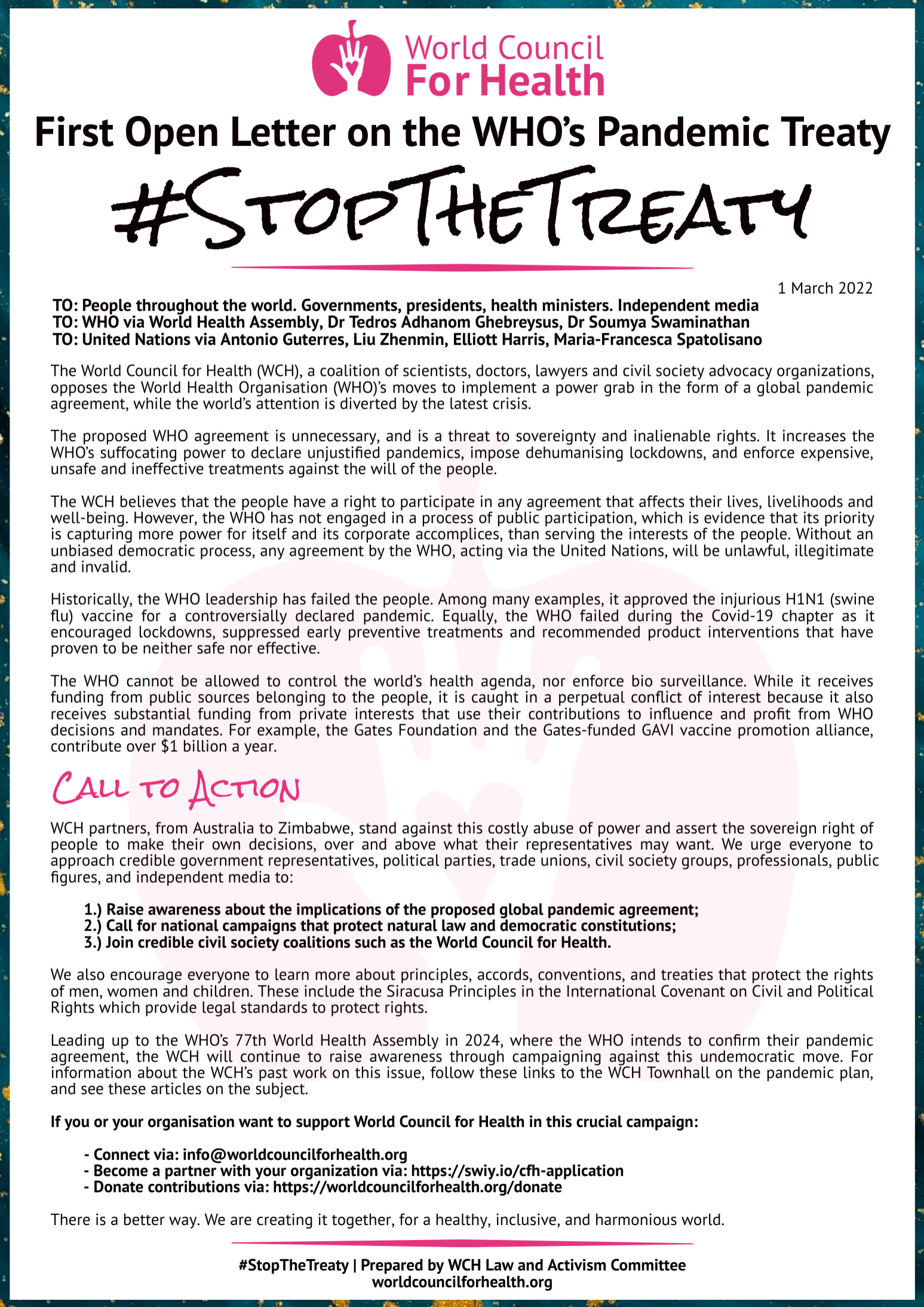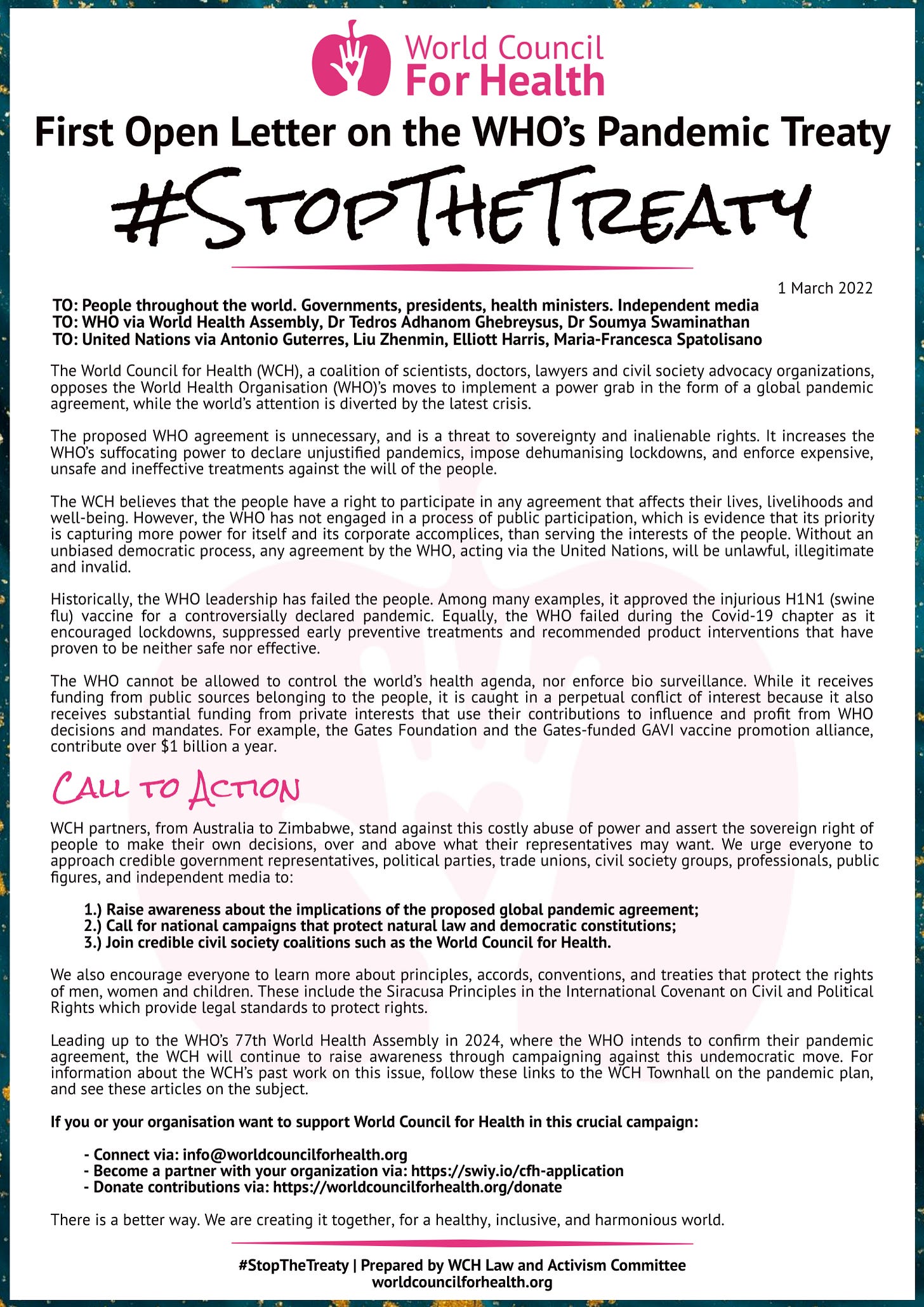I encourage you to read the letter in full, familiarise yourself with the pandemic agreement, and join the World Council for Health in taking action to stop it. The WHO has failed the people of the world time and time again. The last thing we should do is give them more power.
